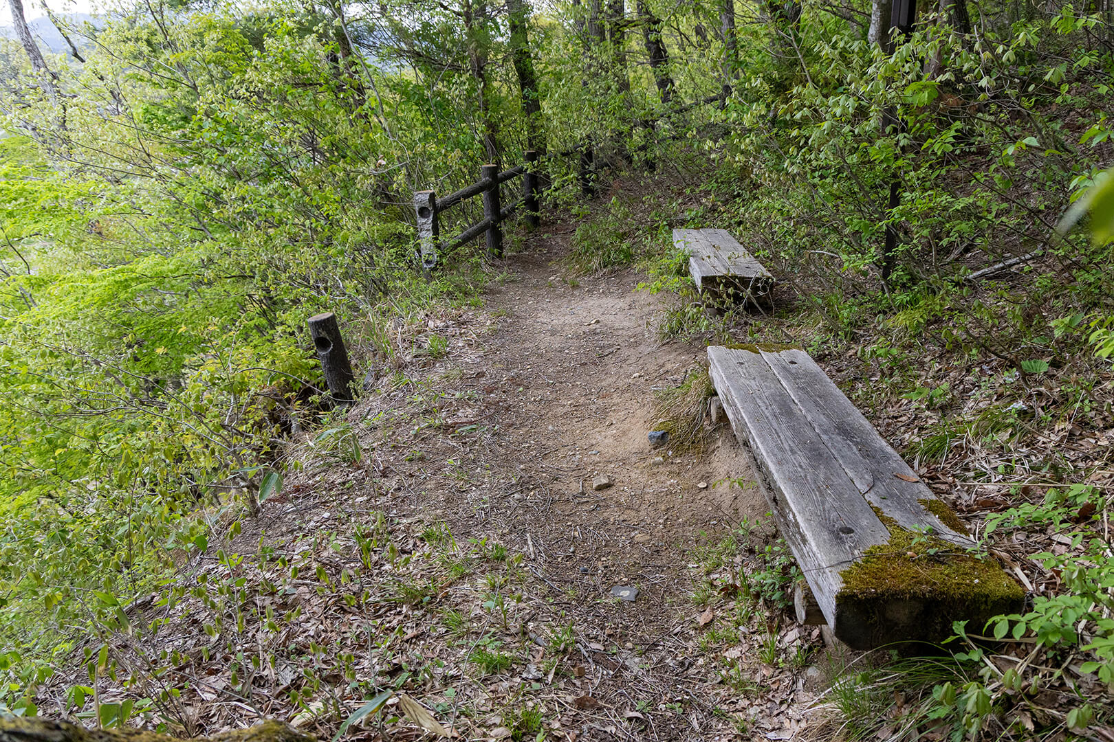 遊歩道登は歩きやすいです。カーブを2回通過してさらに登ると正面に丸太の形状にしたコンクリートブロックで作られた階段が見えます。階段を登り切り、道なりに右へ進むと下りになります。少し進んで視界の開けたところがポイントですが、遊歩道の途中で斜面です。遊歩道登り口に一斗缶と木の棒が設置してあります。熊対策と思われるので、遊歩道を登る前に鳴らすと良いでしょう。次の作例に状況写真を掲載しておきます。