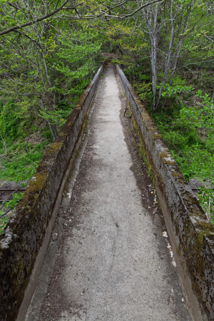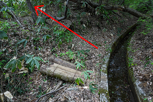 ルート侵入口を登ると水路橋が見えます。撮影時は水路に水は流れていませんでしたが、田植えの時期になると流れると思います。通常の長靴では無理な水深になるようです。
